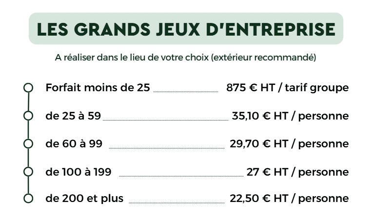 - Nos tarifs incluent la présence de régisseurs afin de gérer l’installation, le briefing et le bon déroulement du jeu ainsi que la désinstallation